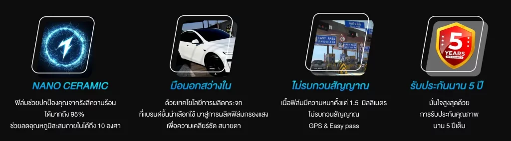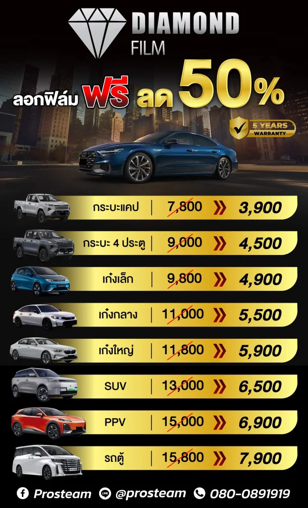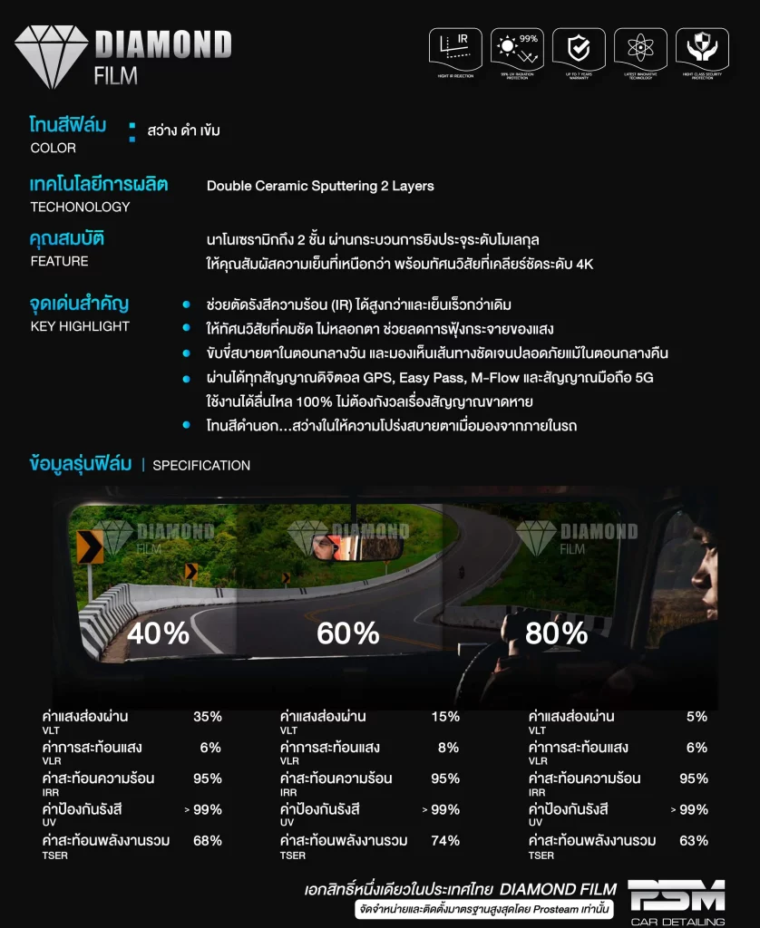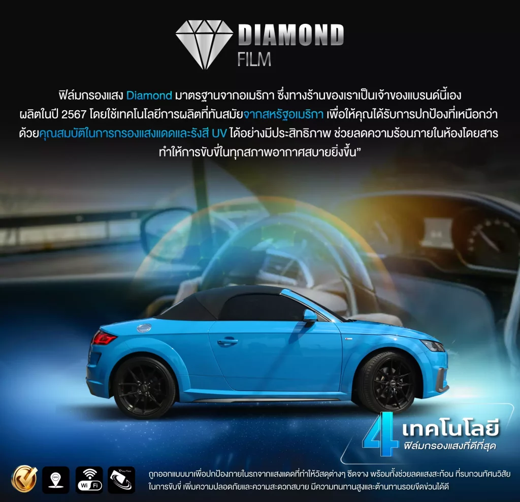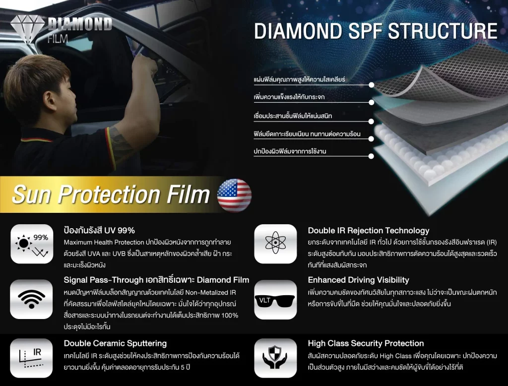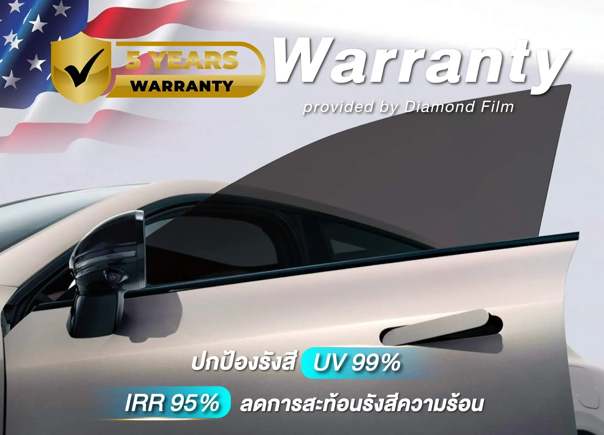 ผลิตภัณฑ์ฟิล์มกรองแสง Diamond มอบความอุ่นใจให้เจ้าของรถด้วยการรับประกันยาวนานถึง 5 ปีเต็ม มั่นใจได้ในมาตรฐานการบริการจากทีมช่างมืออาชีพที่เชี่ยวชาญด้านการติดตั้งโดยเฉพาะ ด้วยนวัตกรรมการผลิตที่เน้นความทนทานเป็นเลิศ ฟิล์มของเราจึงมีอายุการใช้งานที่ยาวนาน คงความสวยงามและประสิทธิภาพได้ดีเยี่ยมโดยแทบไม่ต้องดูแลรักษาเป็นพิเศษ ให้รถของคุณดูดีและเย็นสบายไปตลอดอายุสัญญา